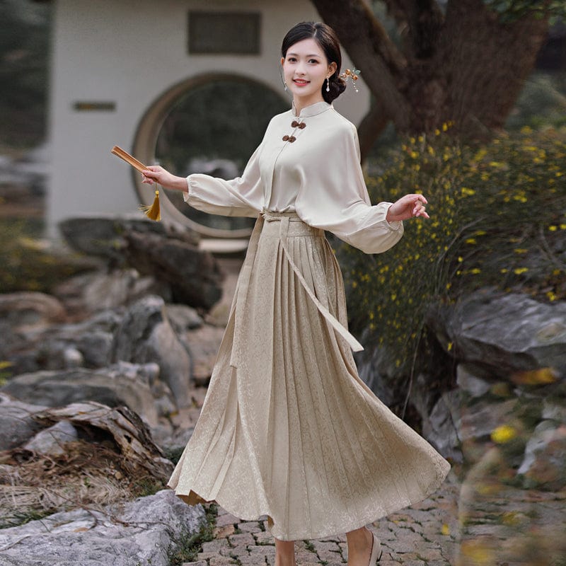 Reforming Style Long Sleeve Shirt Ankle Length Skirt Spring/Autumn Women's Chinese Hanfu Dress