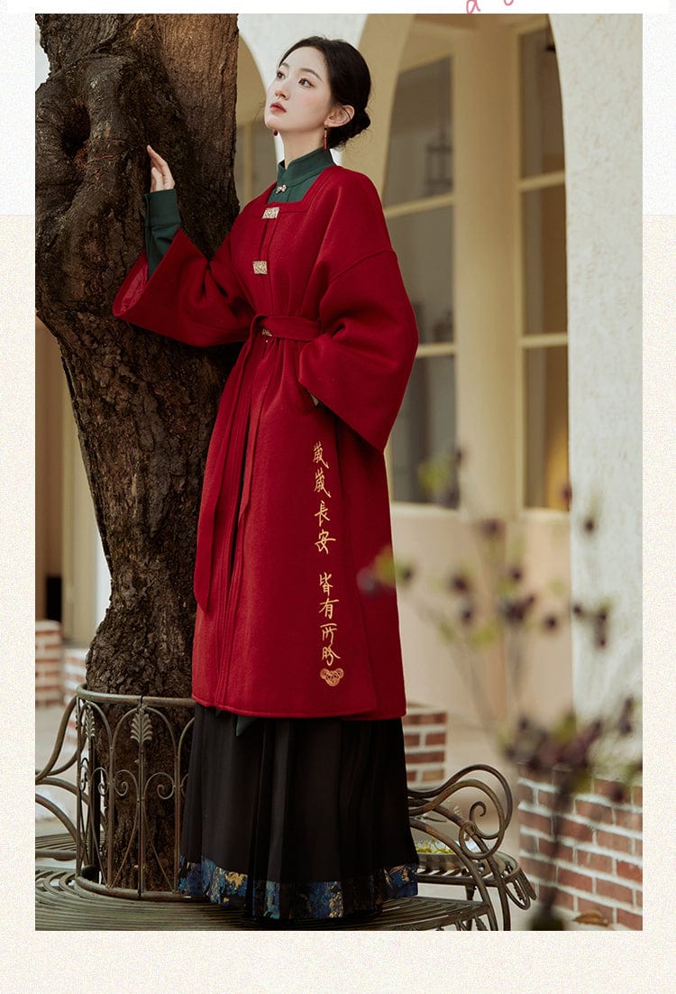 【柏叶浮春】这件汉元素套装,红色呢子披袄,扣型形似窗花,镂空冰裂梅花纹样,风雅高洁;侧摆绣有金色“岁岁长安,皆有所愿”的美好祝愿,寓意吉利,熠熠生辉;立领对襟衫窄袖设计,利落典雅,亲肤保暖;马面裙点翠图案,改良设计,侧边加入拉链,方便穿脱,神秘高级,气质超群。整套汉服撞色设计,选用经典配色,抹换新绿盼春明。